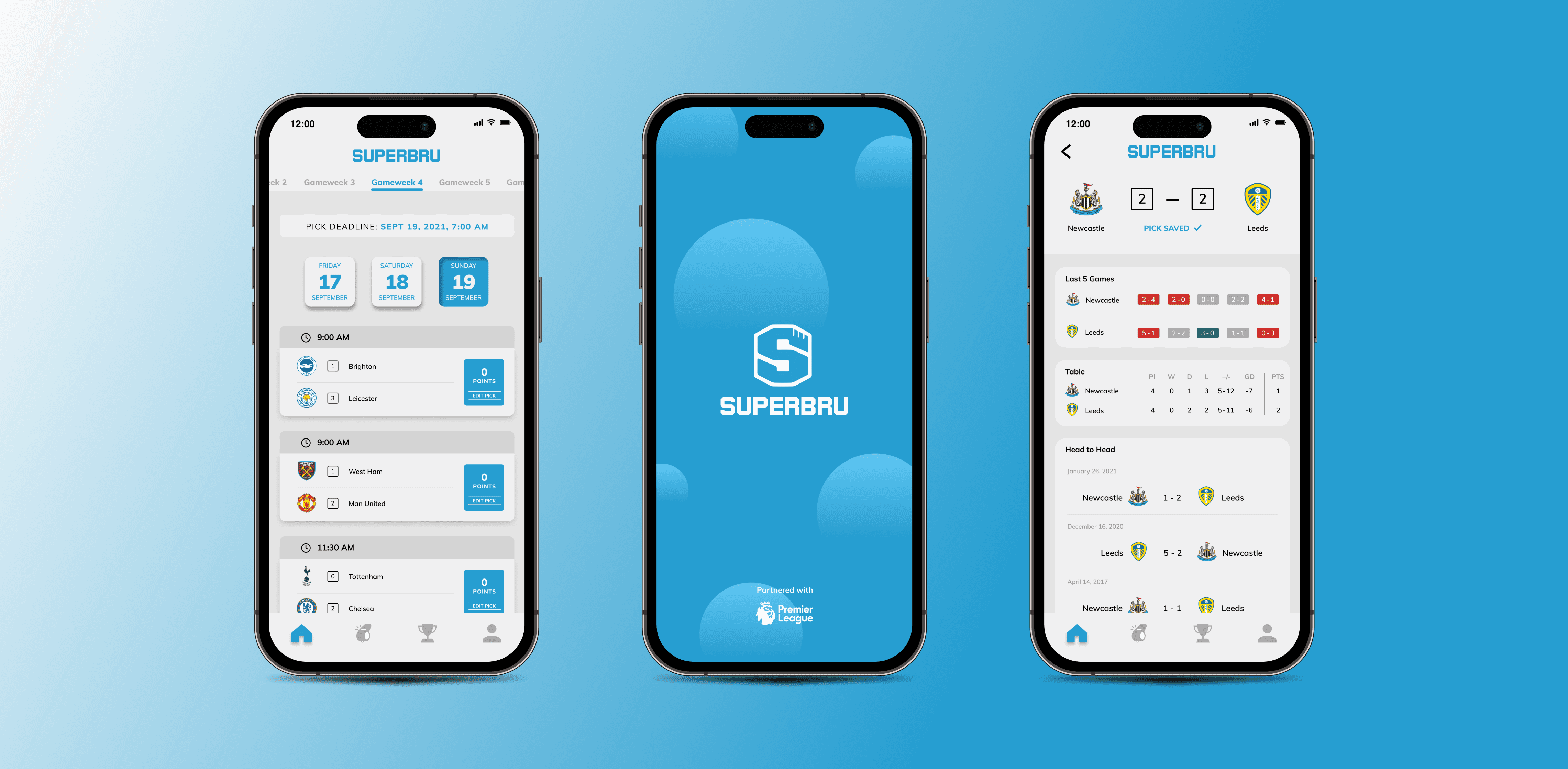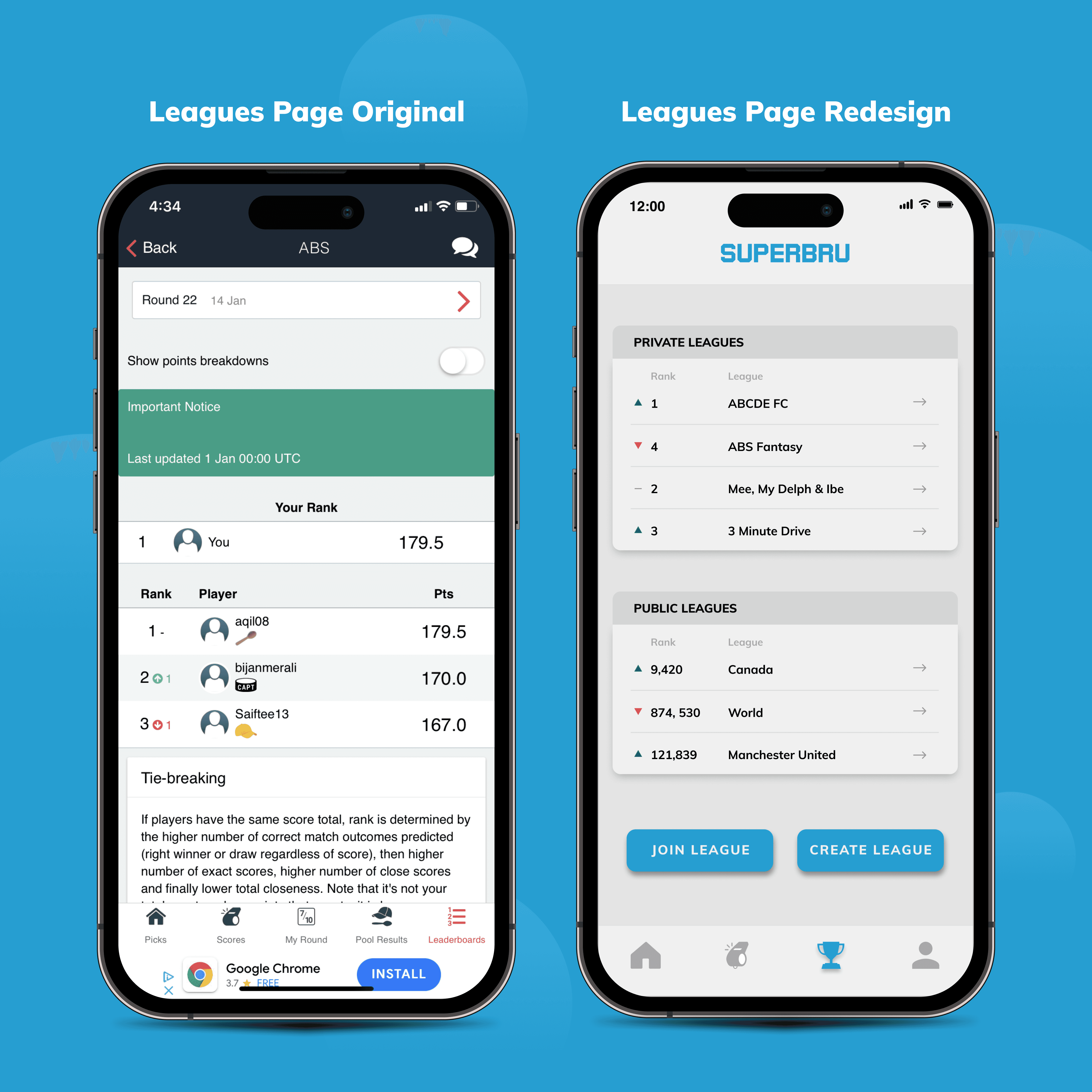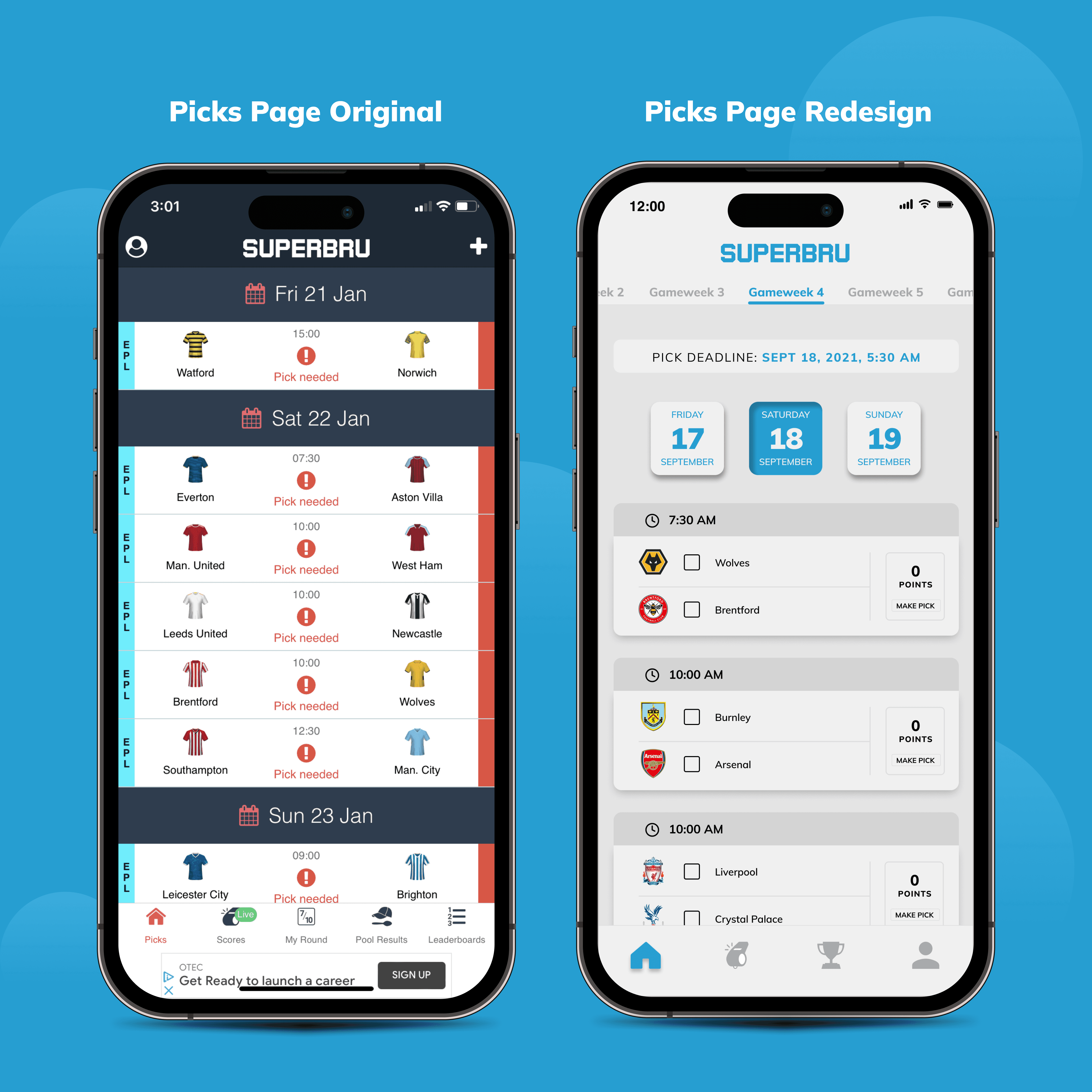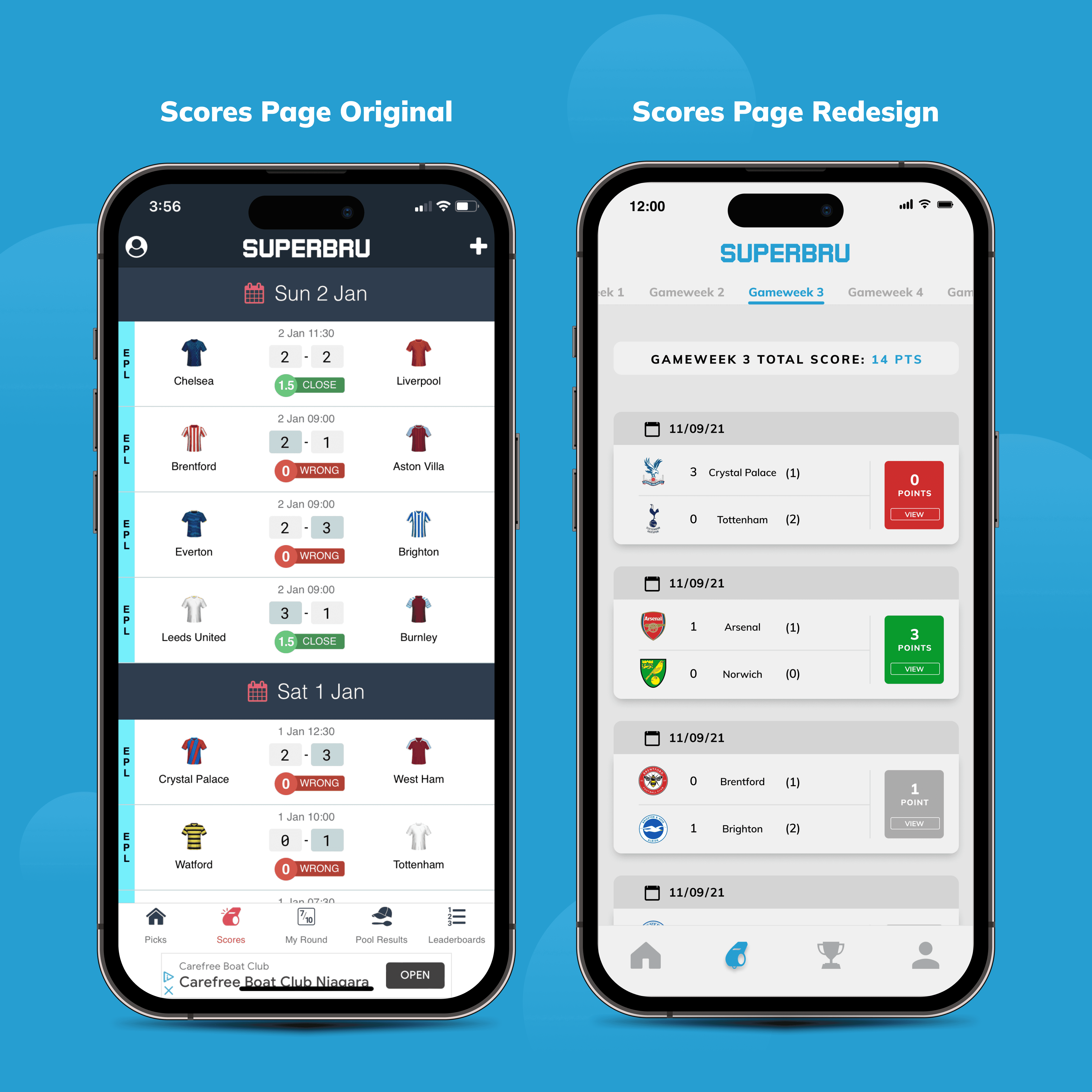 Upon thorough analysis of Superbru's user experience, I identified significant pain points to enhance both functionality and interface of the app. I aimed for a modern aesthetic, drawing inspiration from popular sports apps like FotMob, theScore, and the Premier League app. Analyzing their interfaces provided valuable insights into industry standards, common features and user expectations. While Superbru's existing colour scheme of dark orange and navy blue provided a foundation, I recognized the opportunity to optimize its use. Initially considering the orange hue, I encountered challenges due to its harshness and potential clash with negative connotations associated with red icons. Consequently, I pivoted towards a light blue palette, distinguishing Superbru while infusing a positive and playful ambiance into the design. Using Figma, I went on to create wireframes and then redesign all sections of the app.